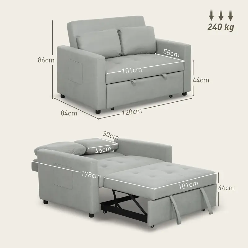 2 Seater Sofa Bed, Convertible Bed Settee, Modern Fabric Loveseat Sofa Couch with 2 Cushions, Side Pockets for Living Room, Guest Room, Light Grey