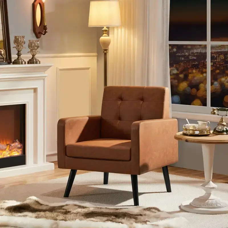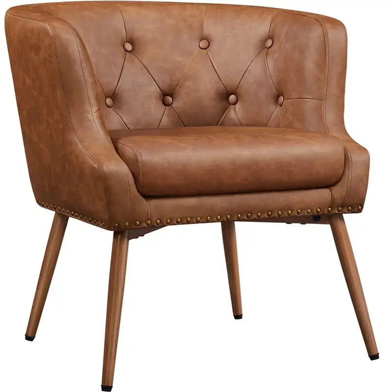 Upholstered Accent Armchair Button Tufted PU Leather Barrel Accent Chair with Metal Legs, Recessed Arms, Nailhead Accents, Mid-Century Modern Club Chair for Living Room/Bedroom, Black/Retro Brown