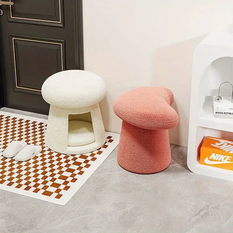 Contemporary Mushroom-Shaped Cat Nest Shoe Changing Stool, Hardwood and Artificial Board Construction, Upholstered, Independent, Under 68.58 cm, Under 3.2 Cubic Feet Storage, No Electricity Needed