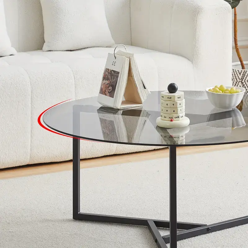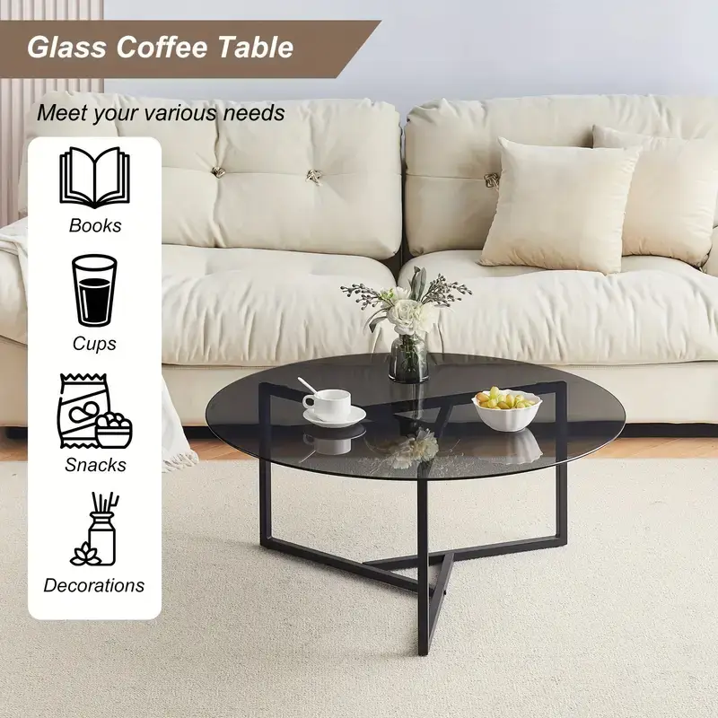 CLIPOP Coffee Table With Metal Frame, Round Clear Glass Coffee Table For Living Room Storage End, Side Table For Home Office
