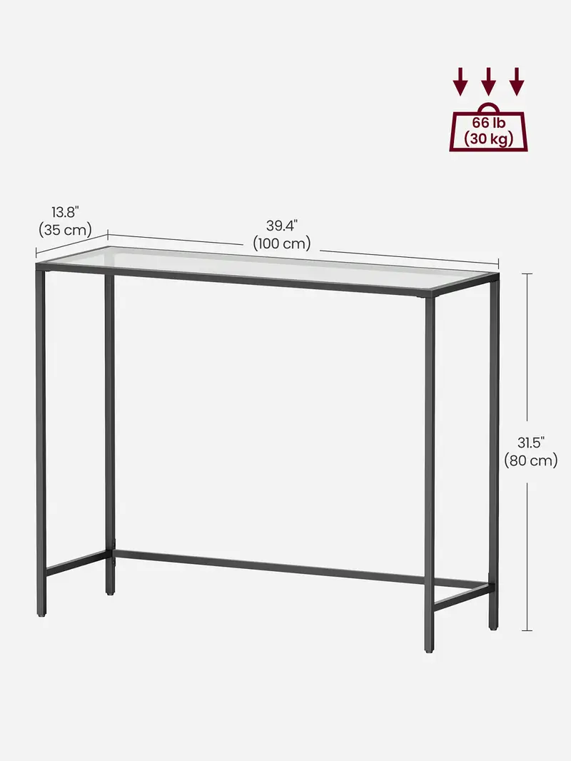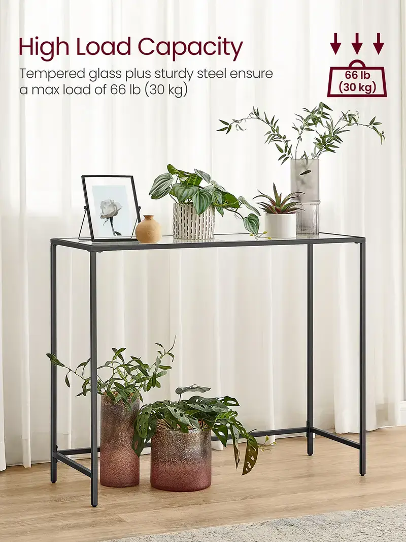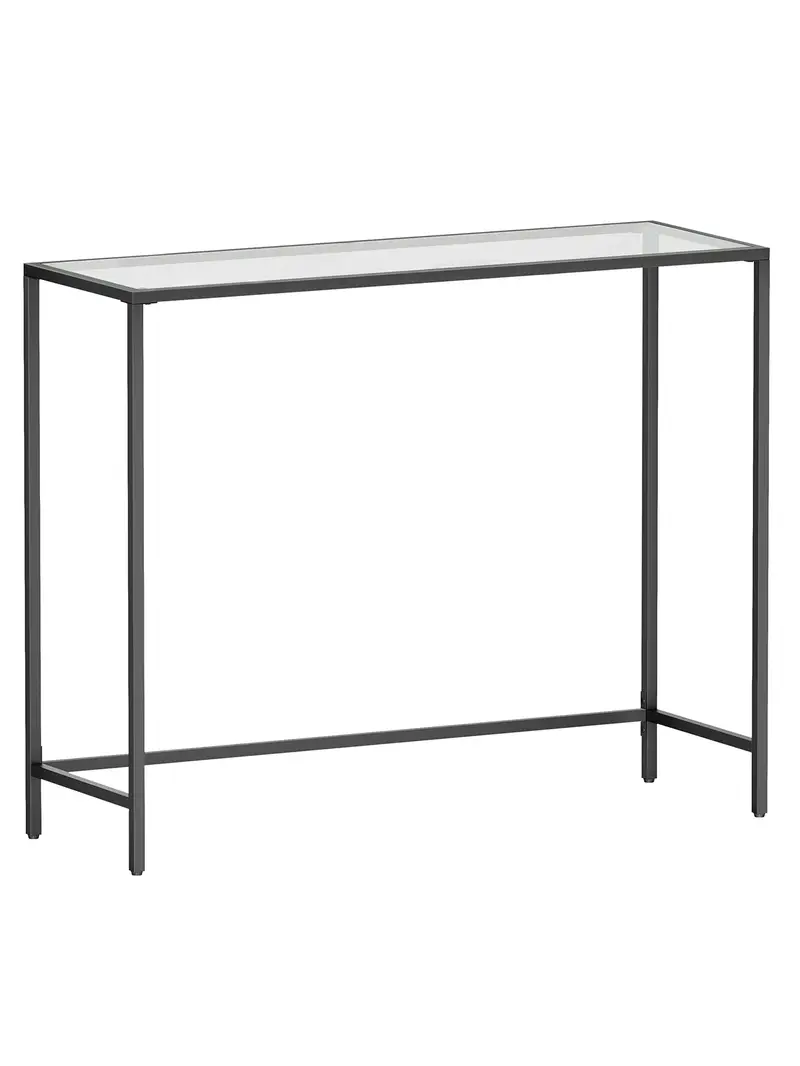 Console Table, Entrance Table, Sofa End, Tempered Glass Table Top, Easy Assembly, Adjustable Legs, for Living Room, Entrance, Hallway, Black and Transparent, Modern Design, Sturdy Steel Frame, Minimalist Style, Wall-Mountable