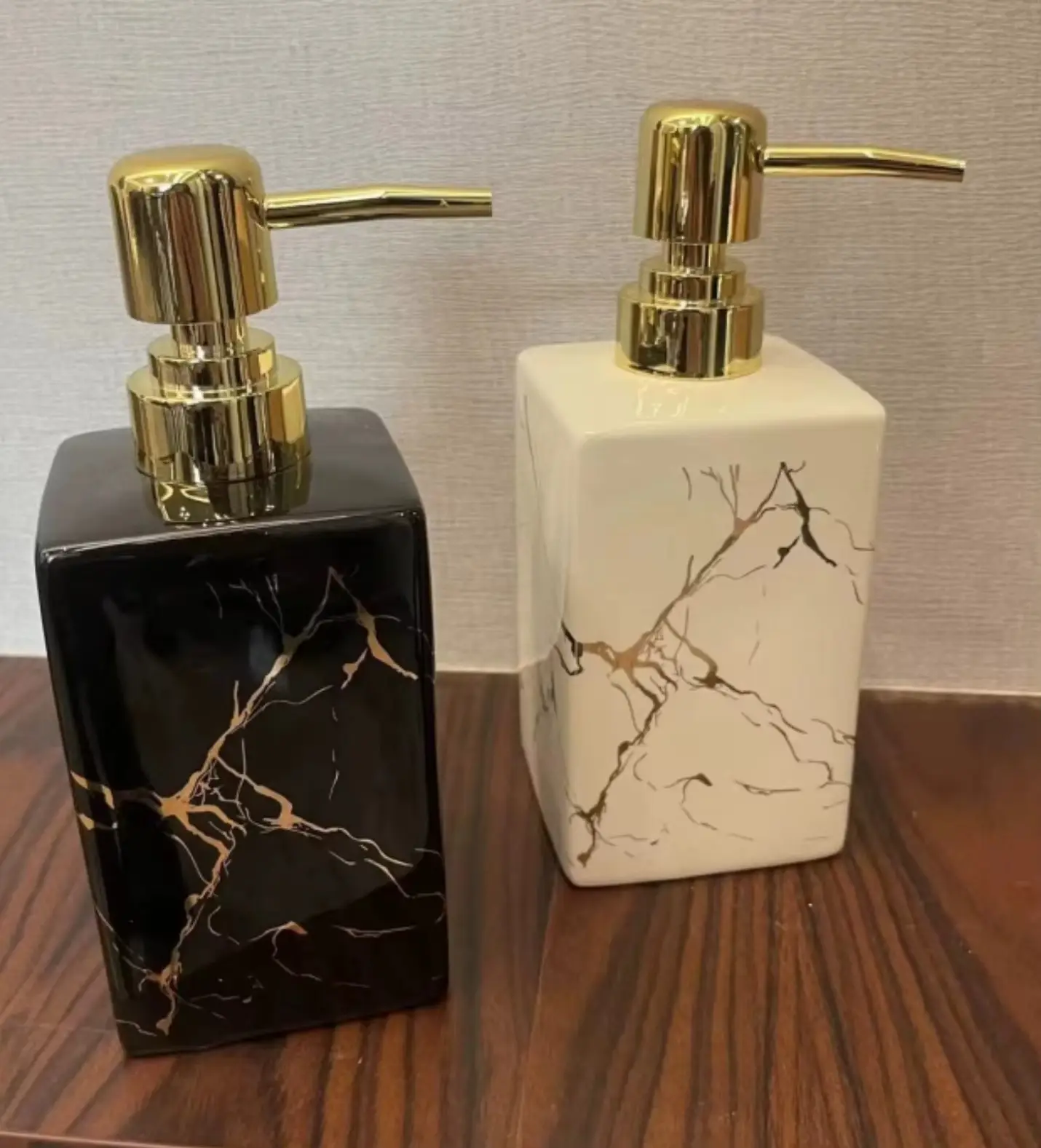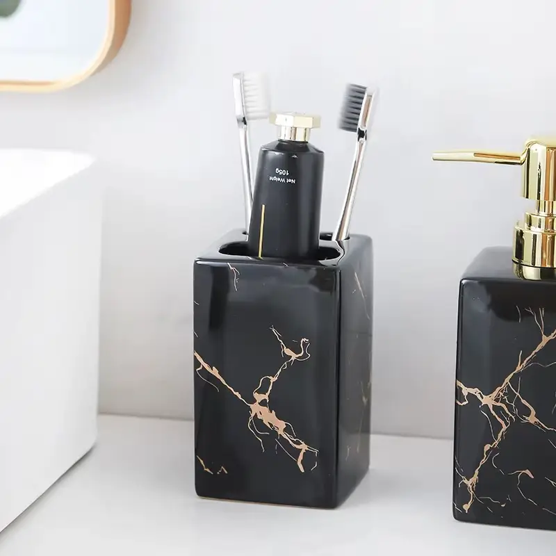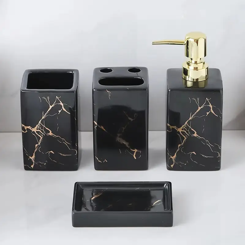 Elegant Black Marble Bathroom Accessories Set for Hotel or Home Ceramic Soap Dispenser Toothbrush Holder Tumbler and Tray