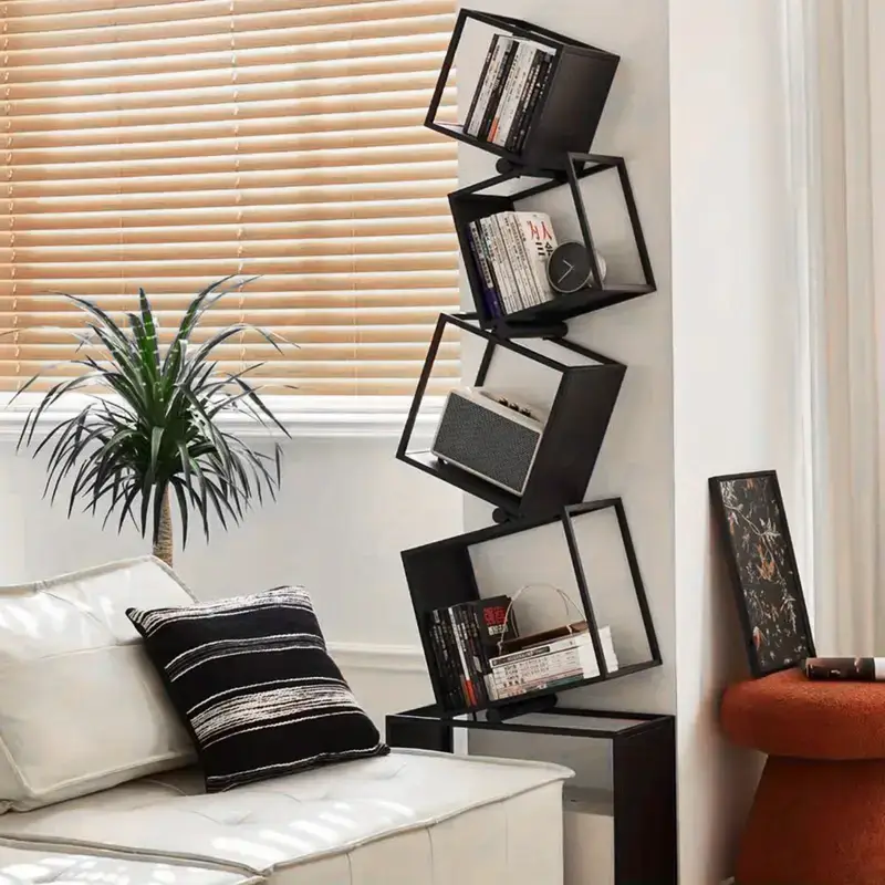 5 Tier Modern Metal Bookshelf, Geometric Bookcase, Tall Floor Standing Organizer with Open Closed Storage, Office Furniture, Narrow Design for Bedroom, Living Room, Home Office