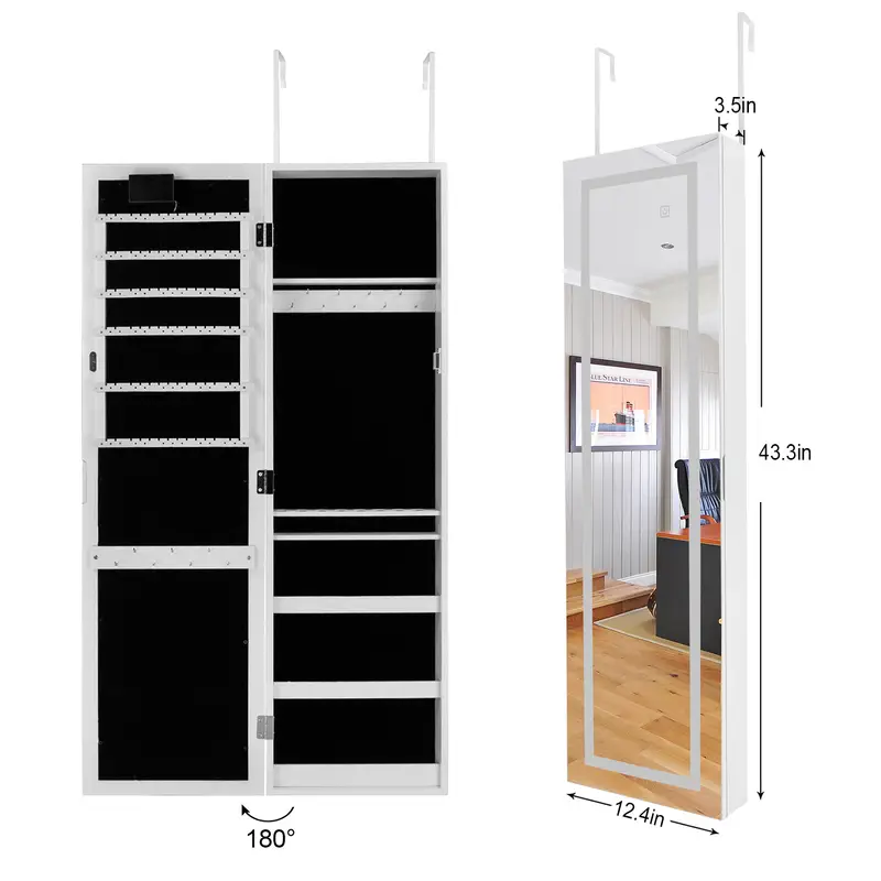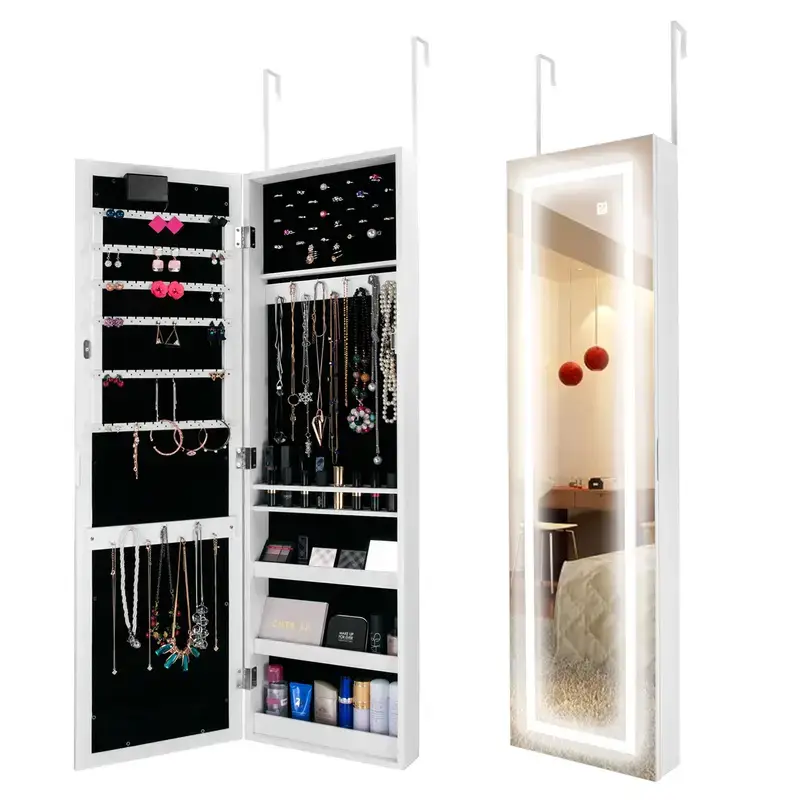 Wall-Mounted & Door-Hanging Mirror Jewelry Cabinet with LED Light – Full-Length Mirror Jewelry Organizer, 10″ W x 47″ H, Elegant White Storage Solution for Rings, Necklaces, Bracelets, Earrings, and Accessories