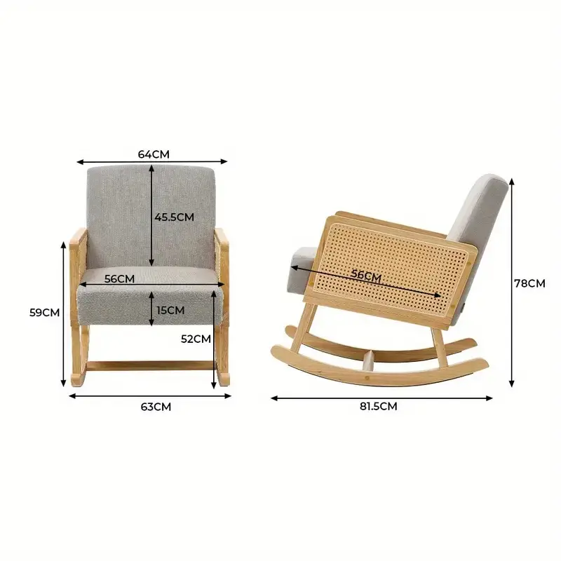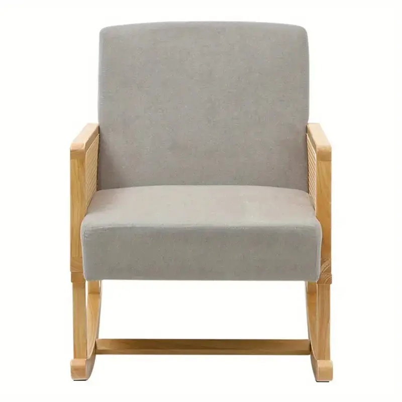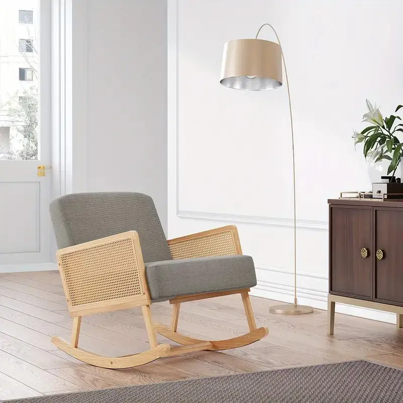 Leisure Relax Rocking Chair, Cotton and Linen Fabric Upholstered Rocker Accent Chair with Rattan Armrests, Lazy Rocking Chair, Solid Wood Modern Leisure Lounge Armchair for Living Room Bedroom Nursery Balcony, Grey