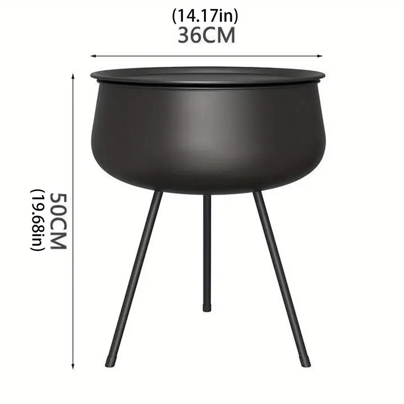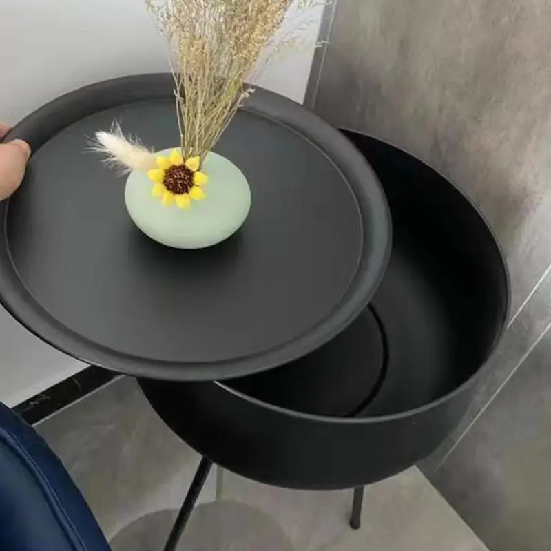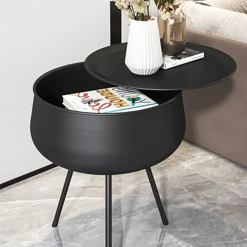 Modern Black Metal Round Side Table with Storage – Sleek Bedside Nightstand Organizer, Sturdy Triangular Structure, Ideal for Living Room or Bedroom, Space-Saving Design