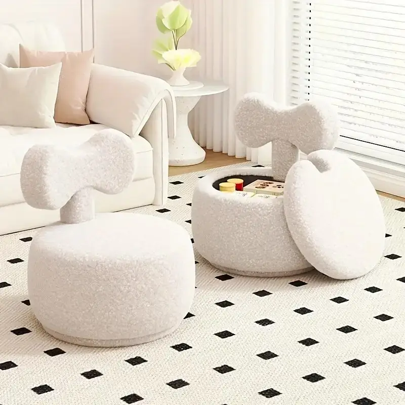 Soft Beige Lamb Wool Swivel Stool – Comfortable Wooden Low Chair with Storage, Smooth Glittery Surface, Home & Office Decor Accent, Versatile Storage Stool | Minimalist Design | Upholstered Seat