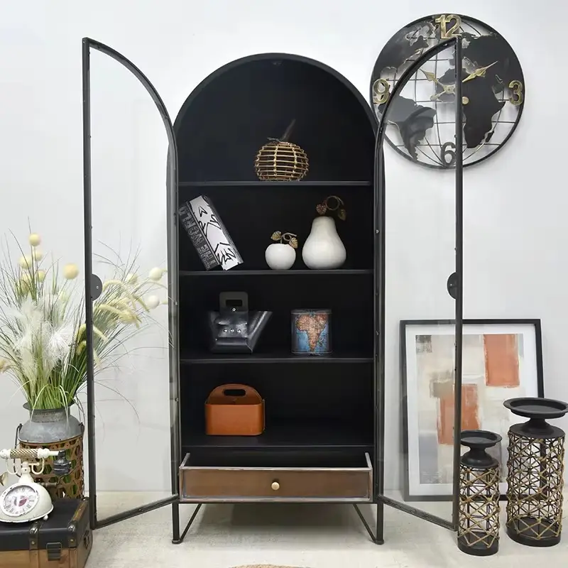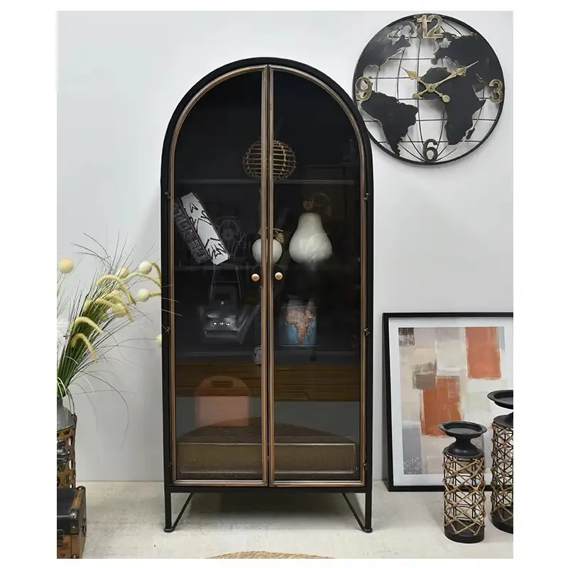 Vintage Industrial Living Room Storage Drawer Tall Metal Cabinet Shelves with Glass Doors Black Arch for Dining Hotel Use
