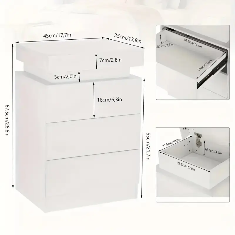 Modern Minimalist White Bedside Table With 3 Spacious Drawers And Soft LED Lighting Stylish Nightstand Storage Cabinet Ideal For Bedroom, Living Room, Or Study
